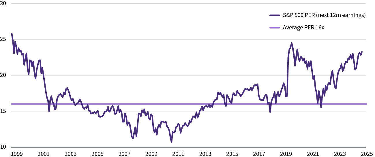 Wir erkennen die hohen Bewertungskennzahlen an, die Anleger für den Besitz von US-Aktien zahlen müssen. Solche Kurse lassen sich nicht nur durch ein förderliches fiskal- und geldpolitisches Umfeld erklären, sondern auch durch die Erwartung, dass Investitionen im Zusammenhang mit KI in Zukunft höhere Produktivitätszuwächse, höhere Margen und ein höheres Gewinnwachstum für US-Unternehmen herbeiführen werden.