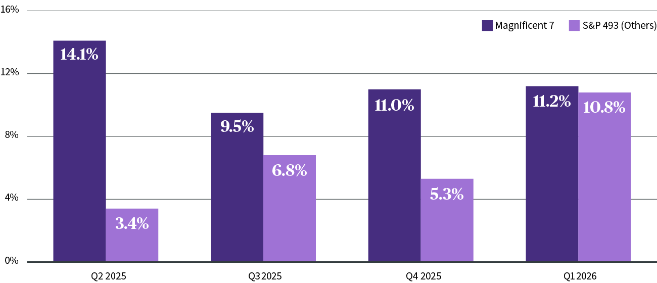 Als Beleg dafür meldeten im 2. Quartal 2025 mehr als 80 % der Unternehmen des S&P 500 eine positive Überraschung bei den Gewinnen. Wie in vielen Quartalen der letzten Zeit wurde das Wachstum von der „Magnificent 7“ angetrieben. Dennoch wird erwartet, dass sich das Gewinnwachstum im Jahr 2026 ausweiten wird. Die übrigen Indexkomponenten, die als „S&P 493“ bezeichnet werden, dürften aufholen und an die Wachstumsrate der „Magnificent 7“ von 16 % anschließen, wie in der nachstehenden Grafik dargestellt wird. Angesichts des breiteren Gewinnwachstums in zahlreichen Sektoren prognostizieren Analysten durchschnittliche Gewinne für den S&P 500, die 2026 ein zweistelliges Wachstum erreichen werden.